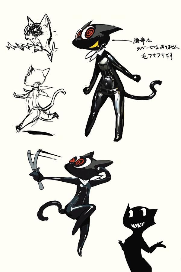 Этот скетч (справа — прим.) был нарисован, когда я объяснял директору Хасино, как представляю себе Воров. Я показал ему скетч, на котором персонаж держит пистолет в профессиональной манере, и у него возникло два вопроса: «Разве вор не выдаст себя, выстрелив из пушки?» и «Не слишком ли реалистичен этот дизайн?». Я нарисовал несколько скетчей с учётом его критики, но Джокер вышел похожим на персонажа из аниме и выглядел очень дёшево. Было непросто подобрать правильный уровень реалистичности.