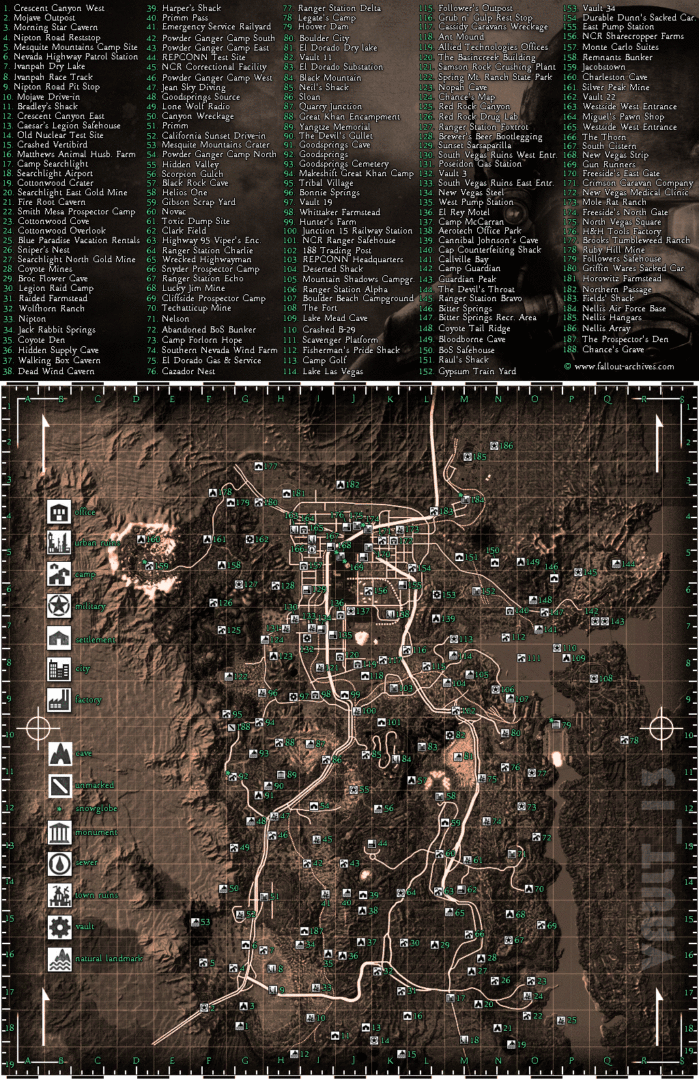 На просторах всемирной паутины была найдена карта игровой Невады из Fallout: New Vegas. Изображение довольно детальное, на нем есть все существующие локации игры, которые только могут понадобиться игроку. К сожалению, на данный момент доступен лишь англоязычный вариант этой карты.