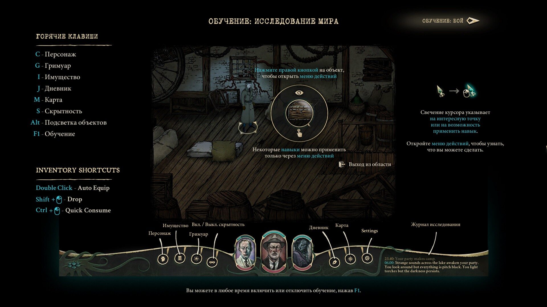 Всё это усугубляется практически полным отсутствием обучения и подсказок. Интерфейс игры изобилует всевозможными значками и терминами, но игра не стремиться объяснять их значение. Из-за этого многие механики выглядят переусложнёнными и неочевидными — игра не сообщает, как часто нужно есть или что означают иконки статусов персонажей в бою.