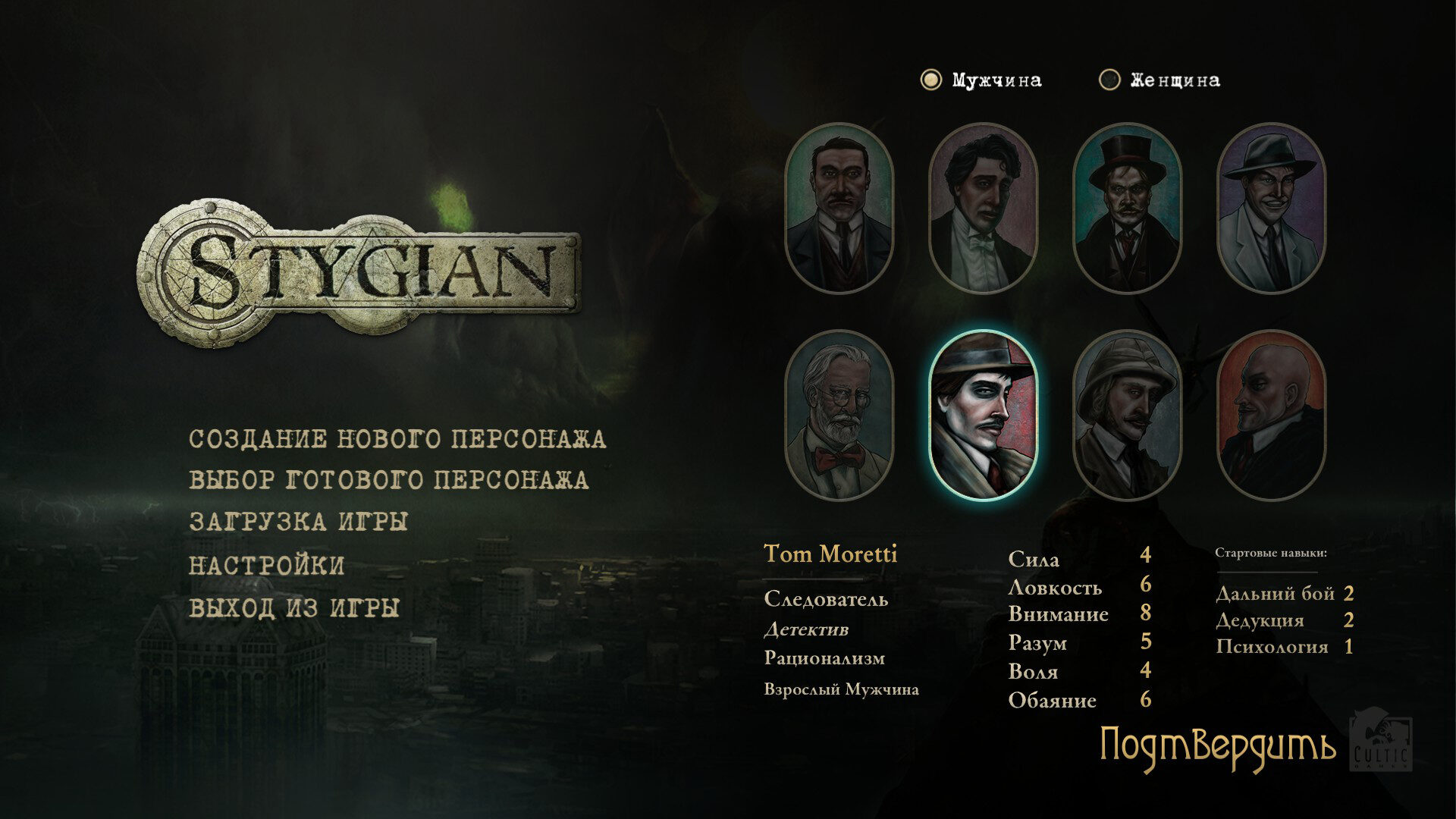 Stygian уделяет огромное внимание тому, какого персонажа мы будем отыгрывать. Честно придерживаясь выбранной роли и выбирая те реплики, которые наиболее близки выбранному образу, вы сохраните свой рассудок относительно стабильным. Таким образом разработчики мотивируют отыгрывать выбранную роль, а не принимать решения, основываясь вашей выгоде как игрока. Первое прохождение я стартовал детективом-материалистом, на что игра постоянно предлагала диалоговые опции, позволяющие придерживаться роли падкого на выгоду сыщика.