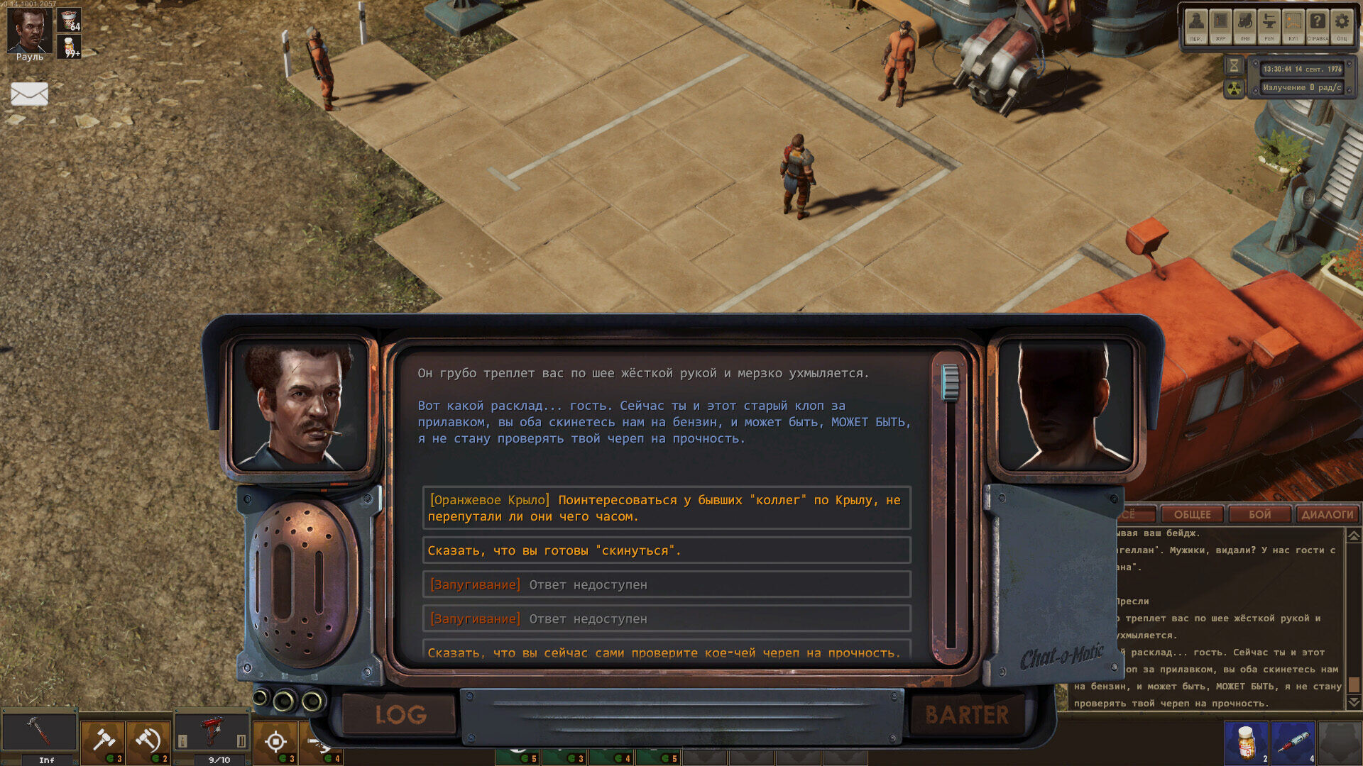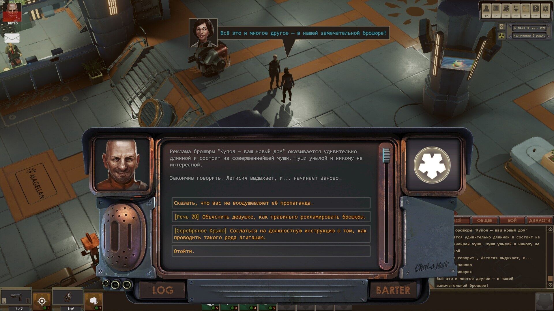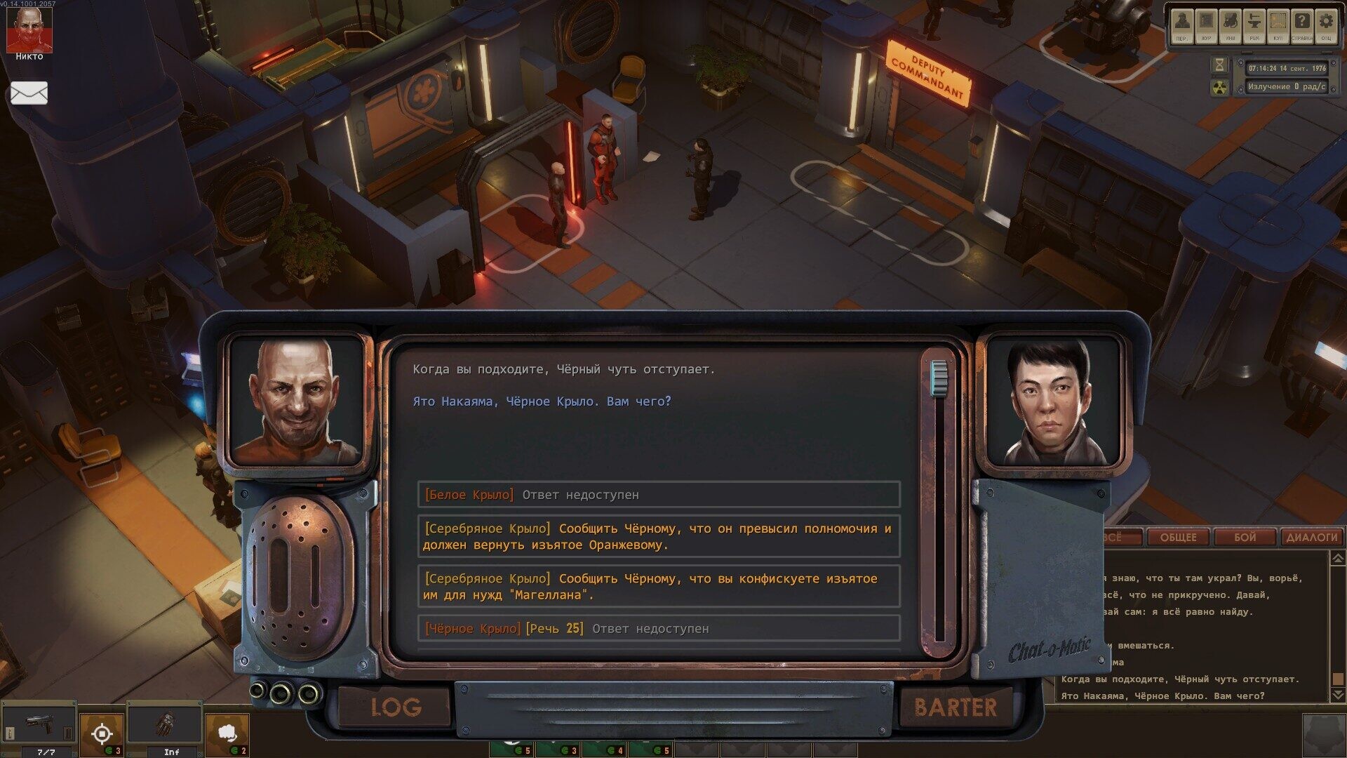 3) Играя не за оранжевых, мне не позволили запустить квест с ограблением, когда нам нужно найти сачкующих работников. Играя за оранжевых появились ветки, где можно их убедить. Отмечу сразу, что в настройках у меня включены скрытые реплики для каждой фракции и играя за белое крыло у меня не было возможности вообще выбрать хоть что-то.