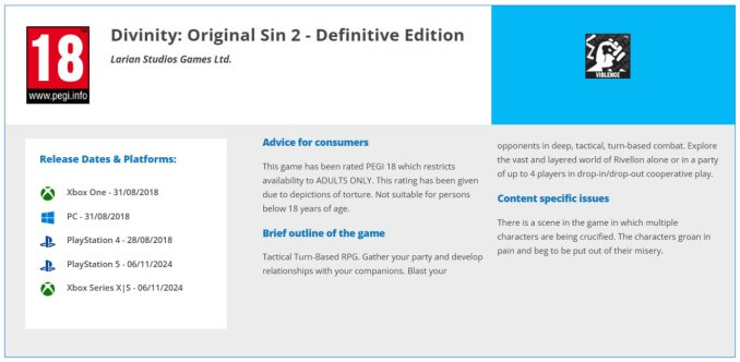 Рейтинговая организация PEGI выставила возрастной ценз ролевой игре Divinity: Original Sin II в версиях для Xbox Series X|S и PlayStation 5 — информация об этом появилась на официальном сайте агентства.