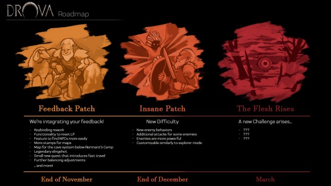 Ещё одна заплатка выйдет в конце декабря — она добавит в игру новый уровень сложности. По словам авторов, режим «Новая Игра+» не подходит Drova, в то время как хардкорная сложность вписывается в концепцию отлично. На ней игроков ожидают:
