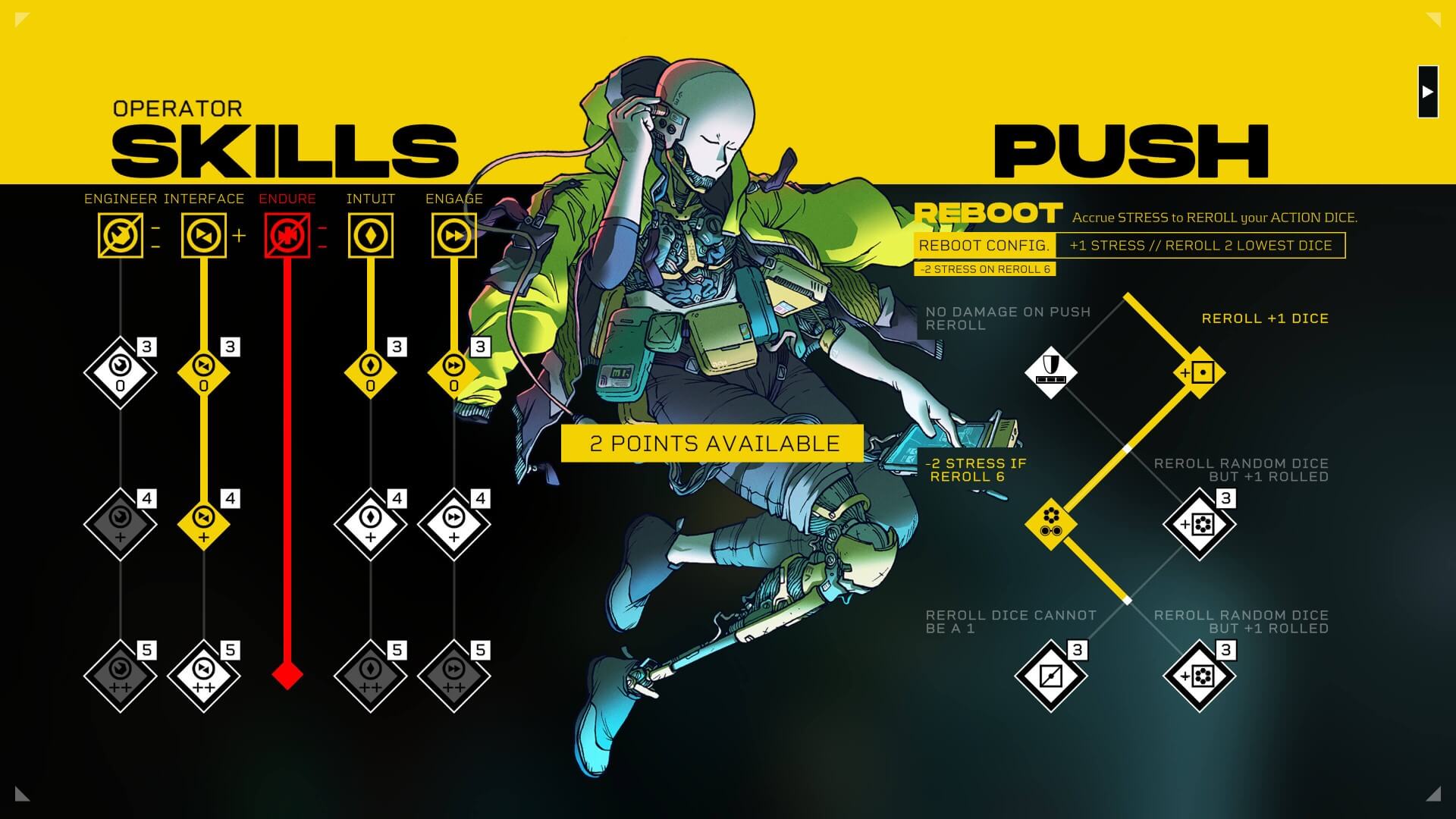 Отправившись на станцию, пользователю предстоит выбрать класс и распределить очки характеристик и навыков (последние разделены на две группы: технические и боевые). Принятые на этапе создания персонажа решения значительно повлияют на стиль игры, поскольку от параметров героя зависит ряд показателей, включая не только возможности по взлому различных терминалов и электронных замков, но даже скорость перемещения.