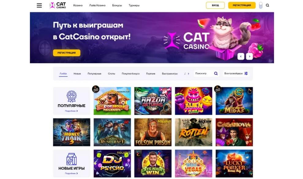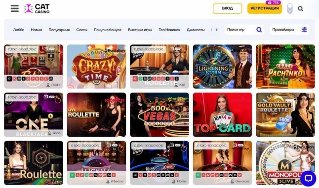 Игровой каталог в казино Cat выстроен грамотно и ориентирован на разный стиль игры. Основной упор сделан на слоты с разной дисперсией и RTP. В каталоге представлены: