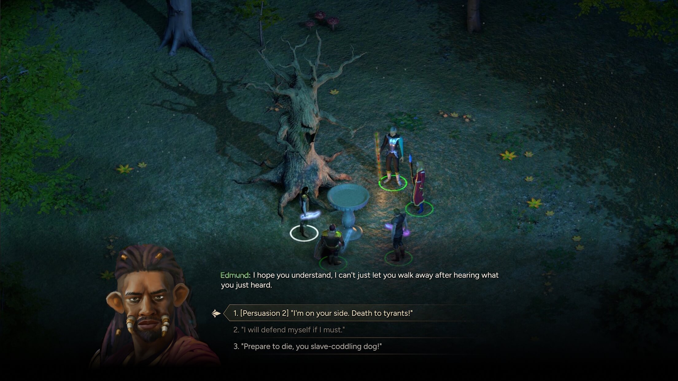 Скриншоты какие-то очень... рандомные. Какая-то полянка в ночи, с размазанной травой и ОЧЕНЬ симпатичным персонажем (наконец репрезентация лапоухих!), на втором я вообще слабо представляю что происходит и какая тут геометрия. Что за разноцветные бивни, тут колонны, там брусчатка, там вторая брусчатка, и еще два разных типа поверхности. ЧТО это вообще %) Почему портрет персонажа дублируется слева? Крч очень странный выбор скринов для открытия кампании.