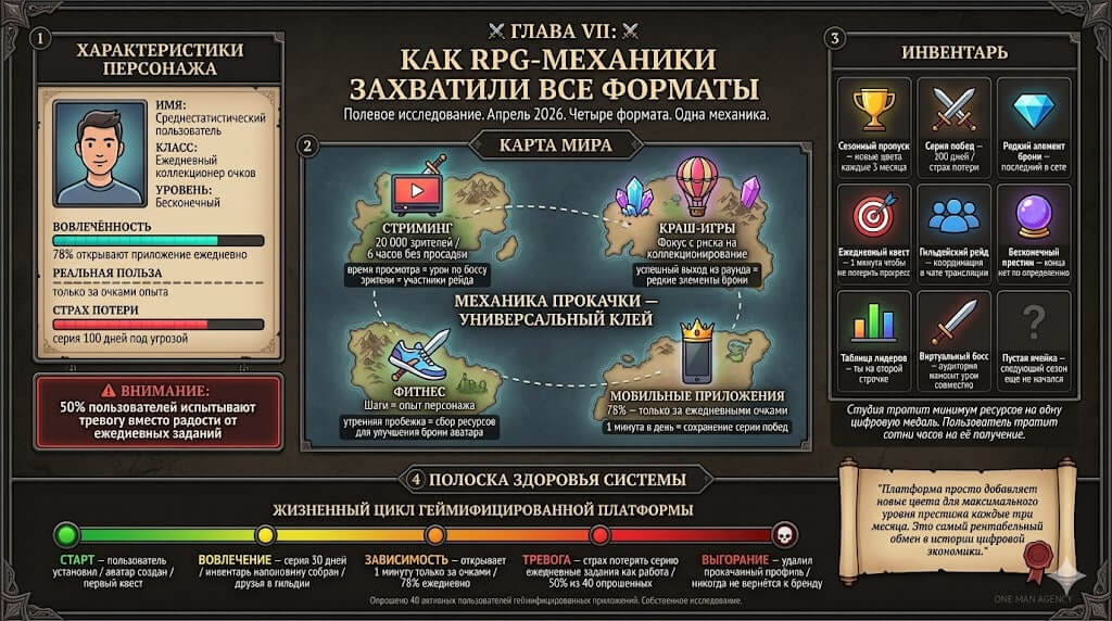 Вы бегаете по парку утром и ваш виртуальный аватар собирает ресурсы для улучшения брони. Вы смотрите прямую трансляцию на Twitch и зарабатываете очки лояльности канала для получения нового цвета ника в чате. Механика прокачки стала универсальным клеем. Этот клей намертво привязывает аудиторию к платформе независимо от реального качества самого контента.